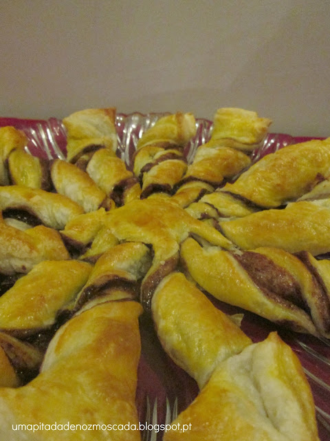 2. Espalhe o creme de chocolate (+/- 2 colheres de sopa) por cima de uma das placas de massa folhada (se necessário aqueça o creme uns 10-15 segundos no microondas para ficar mais macio).